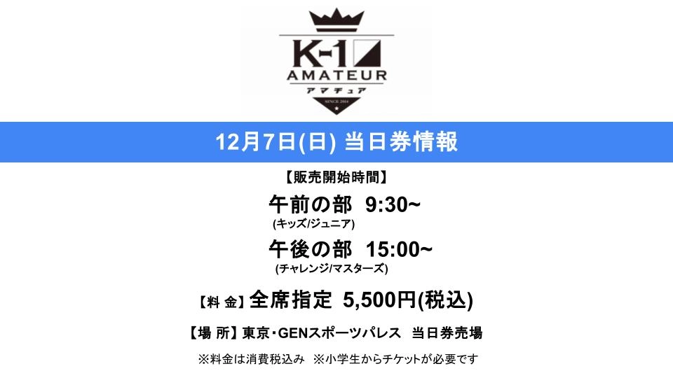 大会当日9:30より「GENスポーツパレス・当日券売場」にてK-1キッズ/K-1ジュニア(午前)、15:00よりK-1チャレンジ/K-1マスターズ(午後) をそれぞれ若干枚数発売いたします。