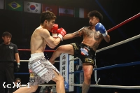 2R、プレッシャーを掛けんとする佐々木だが、パコーンはそこにカーフキック。佐々木の蹴りにはストレートを合わせる。パコーンはカーフを追加し、佐々木の踏み込みはバックステップしていなしてしまう。脚への前蹴りで佐々木を止め、さらにパコーンは右ストレートと左ストレートも決める。