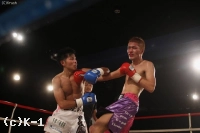 1R、サウスポーに構える靖仁が距離を取りながら左ストレートとバックキック。細越が前に出てくるところに右フックを合わせる。靖仁は構えをスイッチしながらステップし、ジャブとワンツー、バックブローを狙う。細越はワンツーとヒザ蹴りでプレッシャーをかけ続け、終盤、下がる靖仁に右ストレートを当てる。