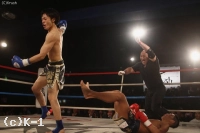1R、距離を取りながらジャブを当てて、右フックにつなげる塙。林もジャブも返して左フックのカウンターを狙いながら前に出る。塙は前蹴りとミドルで距離を作りつつ、パンチの打ち合いになると左フックでダウンを奪う。再開後、塙はパンチとヒザ蹴りで一気に襲いかかる。
