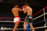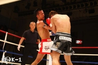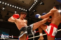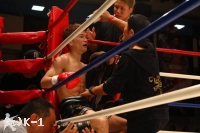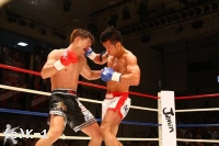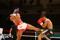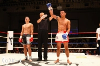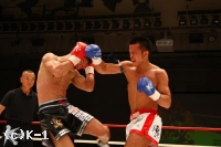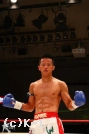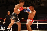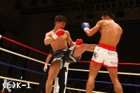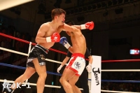 3R、開始とともに明戸は前に出てフック・アッパーからローを繋ぐが、郷州はこの攻めをしのぐと右ロー、左ボディ、ショートのアッパーと盛り返して押していく。郷州の左ボディがとらえると顔がゆがむ明戸。明戸もブロックでビッグヒットを避けるが、郷州は最後までスタミナを切らさず右アッパー、左フックと明戸を襲い試合を終える。