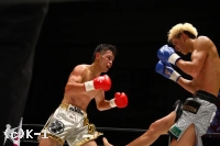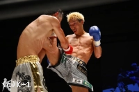 3R、このラウンドも前に出る岩崎に対し、瑠輝也もバックステップで距離を作りながら、時に押し返してミドル、ストレートと攻撃を返す。岩崎は右ストレート、左フックとパンチを当ててさらに攻めるが、ここで瑠輝也は右ボディストレートをリターンし、岩崎の動きを一瞬止める。しかし岩崎はすぐに反撃に移り、右ストレート、左ハイと瑠輝也に攻撃を返す。最後はコーナーに詰める岩崎に、瑠輝也も左右ボディアッパーを返して終了となる。