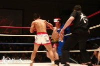 2R、郷州は圧力を弱めず前に出ると右アッパーのヒットを皮切りに連打をまとめる。だが渡辺はステップを止めずに体を入れ替え、ハイ&パンチで反撃する。しかし渡辺の傷が開いて血が流れてきて、ドクターチェックが実施される。再開。だが、両者左右のストレートを激しく振るって打ち合うと、再び渡辺から出血が見られ、再度のドクターチェックとなる。再開後、ここでも両者は打ち合いとなり、右のパンチをアッパー、ストレートと打ち分けた郷州が最後は左フックで2度目のダウンを与える。