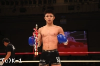 「(試合を振り返って?)課題も見つかったんですけど、タフな大岩選手を一発で倒せたのは自信になりました。(対戦相手の印象は?)左を何発かもらっちゃったんですけど、飛び込みのスピードが早いと思いました。(今後の目標は?)あと2試合、もっと圧倒的に勝てるように練習して、ベルトを巻いてそこからK-1にどんどん出ていきたいと思います。