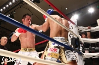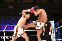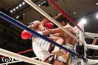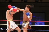 2R、一層前進と圧力を増す郷州。山本はやはりサイドに身体を交わし、サウスポーに変わって、左ストレート、右フックを当てて郷州に迫る。しかし郷州も右ストレートをかえし山本を脅かす。膝も鋭く突きさす郷州は右ストレート、左フックと連続でヒットさせる。再び左ハイを当てる山本だが、郷州は止まらない。なおも郷州は右ストレートと左フックで山本にダウンを迫る。