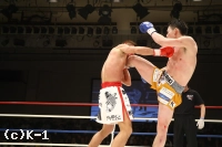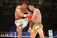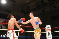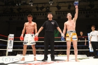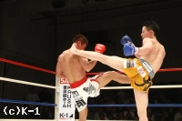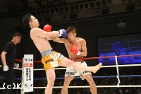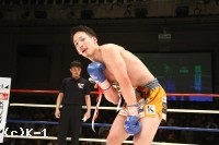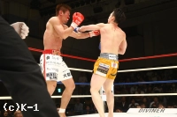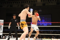 3R、鼻血が出る牧平だが、ロー・ヒザ・ミドルと蹴りを放って前に出る。松岡はこのラウンドもパンチを中心に応戦。牧平の蹴りにパンチを合わせ、その威力を半減させる。さらに松岡がフック・ストレートと連打を打ち込み、牧平はアゴが上がる。そして組みつきが多くなり牧平はレフェリーからイエローカード、減点1を受ける。最後は松岡がアッパーにストレートを織り交ぜた連打で牧平を襲って終了する。判定は29-27、30-27、29-27の3-0で松岡。蹴り対決かと見られたが、パンチを軸に戦い勝利した。