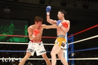 1R、牧平はサウスポーからジャブをスピーディーに突き、蹴りを狙う。これに対し松岡は間合いを取って無理に前に出ない。松岡は牧平の蹴りをさばきながらストレートを飛ばし、牧平の鼻柱を紅くする。