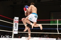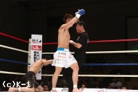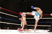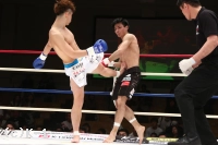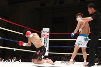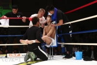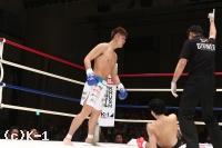 2Rに入っても勢いに乗る寺島は前に出て左ボディを突き刺しダウンを奪う。小島が立ってくるとさらにボディを追撃し、ハイキックで2度目のダウンを奪う。小島は立ち上がるも足に異状があったか、足を気にする素振りを見せる。寺島はそこへ跳びヒザで襲い掛かり、小島が押し倒されるように崩れると、レフェリーはここで試合を止めた。