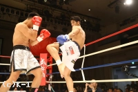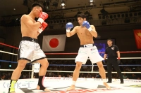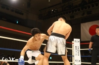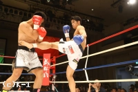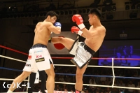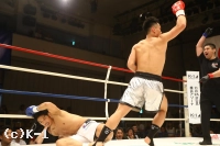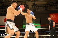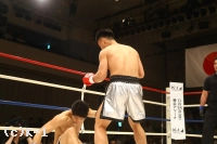 1R、功也は先にワンツーで切り込み、続いて蹴りを放っていく。しかしロープ際に下がり右フックを放とうとしたところでシュアイの右フックが先にヒット。立ち上がった功也だが足元と目がおぼついておらず、レフェリーが試合をストップした。