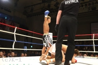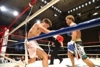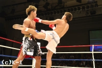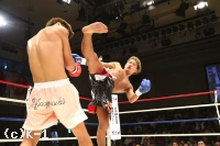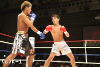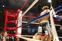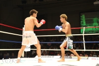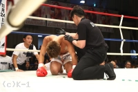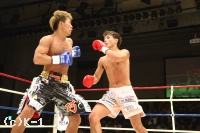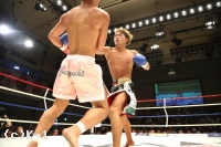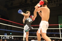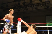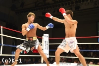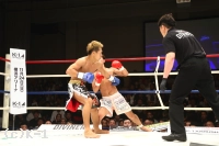 1R、両者スピードあるローを飛ばし合う。横山は右のフックが冴え、顔・ボディとサウスポーの里見を襲う。里見も踏み込んでの左ストレートを伸ばすが、横山はヘッドスリップで当てさせない。横山は距離感を掌握しているか、里見の入り際に左ショートフックを当てダウンを奪う。