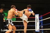 ダメージがうかがえる島野だが、立ち上がると引かずに打ち合う。成合は右ストレートで島野の顎を上げるが、島野は打ち合いに応じハイキック、右クロス。これに成合は右スイングフック、左フック。島野は顔にヒザを突き上げ、右クロスで成合を倒してダウンを奪い返す。カウントギリギリで立ち上がる成合。島野は左フックを打ち込み、さらに右クロスで向かう。フラつく成合だがダウンを逃れて2Rを終える。