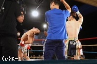 1R、堀井がオーソドックス、金子がサウスポーで対峙し、金子のローが2度ローブローとなってしまい堀井は悶絶し、股間を押さえてうずくまる。再開すると、金子は右フック・左ストレートと強打を振るう。堀井はこれをさばきながら右ストレートを返すが、ここで三度(みたび)金子のローブローが入ってしまい、堀井はここもうずくまる。このまま堀井は立ち上がれず、度重なるローブローで試合続行不可能になったため、堀井の反則勝ちの裁定となった。