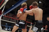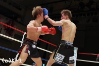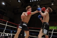2R、晃貴はカーフを織り交ぜ、右の強打を振るっていく。上下に攻撃を散らす晃貴は右だけでなく左フックも決める。黒田はこれに長身を利したヒザ蹴りで反撃。踏ん張ってパンチを振るう晃貴に黒田は顔への飛びヒザを狙う。晃貴もしかし右・左とフックをフルスイングしていく。