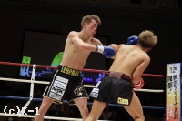 3R、打ち合いから黒田はポジションを入れ替えて晃貴にロープを背負わせ、黒田は右ストレートをヒット。さらに晃貴のボディへのヒザを送り、再度の右ストレートで攻める。だが、晃貴はタフさを発揮し前に来る。やや失速も感じられる晃貴だが黒田に対し間合いを詰め、右ストレートと左フックで黒田を押し返す。