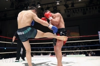 2R、体の強さを感じさせる夜叉猿は前に出てパンチの連打を山崎にガードさせ、そこから右ローを効かせる。山崎はロープを背にするも、夜叉猿の打ち終わりに右ストレート、左フック、ヒザと返していく。山崎、夜叉猿の順に両者カーフキック(膝から下・ふくらはぎを蹴るローキック)を打ち合う。