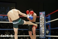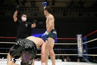 3R、右ローを効かせて夜叉猿が出るが、山崎は右フック・左フックと打ち返して効かせる。だが夜叉猿も応戦し、左フックから右ローで山崎を転倒させる。夜叉猿はなおもローを止めずに攻める。山崎はフックを振るうが、夜叉猿はそこにカウンターの右ローを合わせてダウンを奪う