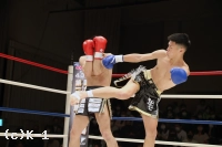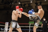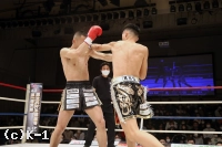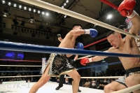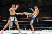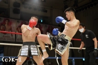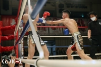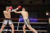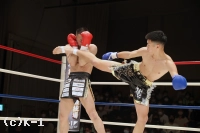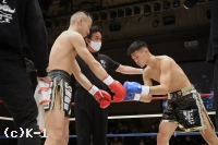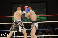 2R、宮崎が距離を詰めようと前に出ても、石田はスッと下がって間合いを詰めさせない。左ミドルもバチンと音を立て、宮崎を懐に入れさせない。左ストレートから入って右フックの連打、そしてバックブローと石田は宮崎を攻める。