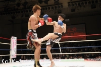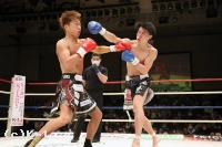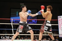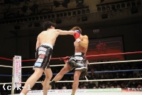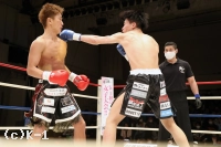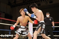2R、國枝もカーフキックを出し岡嶋を嫌がらせるが、岡嶋がカーフキックを再度見せて國枝にダメージを与える。國枝はカーフが気になるか、踏み込みが減る。岡嶋は顔へのストレート、國枝はボディブローで応戦する。
