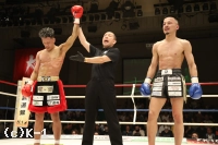 延長R、両者手数を増していく。宮崎は右ミドルを当て、佑典が振るうパンチはかわして空転させる。佑典が左ミドルを放った時に宮崎の蹴りが下腹部に入ってしまい、一時インターバルとなる。再開すると佑典は勢いを戻し、左ストレート、右フックを連打。印象的な攻勢を作るが、宮崎も右ストレートを当てる。判定は3者10-9で佑典。延長で攻勢を作り、接戦で勝利した。