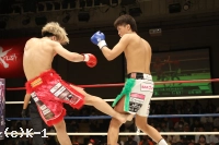 1R、オーソドックスの両者はローを蹴り合う。どちらもローにカーフキックを織り交ぜて蹴り合うなか、TETSUのローとカーフキックが多くなり、三宅はそこに左フックを狙っていく。ラウンド後半は両者やや離れ、ミドルキックを蹴る距離となる。