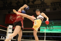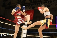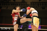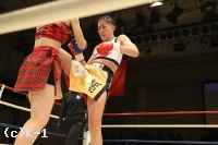 2R、パンチで攻めてくる麻央に対して、池内はヒザ蹴りで応戦。麻央はハイキック、ローキック、前蹴りのコンビネーションを繰り出す。さらにローキックを放つ麻央。池内もローキックででやり返し、ヒザ蹴りを放ちながら前に出る。池内の左ストレートが炸裂するが、麻央もすぐさまパンチでやり返して前に出る。