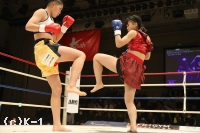 1R、まずはローキックを打ってから、両者パンチを繰り出していく。さらにヒザ蹴りを打ち合う両者。麻央はローキックとパンチのコンビネーションを繰り出すが、池内も下がらない。麻央はパンチとローキック、ミドルキックのコンビネーションを決める。池内は前蹴りを出しながら距離を取り、ハイキックからのバックブローだ。