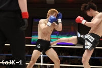 1R、上垣内がまずは前に出てストレートからローキック。さらに前蹴りを放って突き放す。対する茶圓も前に出て挽回。右のローキックを打ちながら前に出ていく。だが、上垣内は下がりながら距離を取って、右のローキックを連発。それに対して茶圓も距離を詰めて、ローキックを放ちパンチを振るっていく。上垣内も自分のリズムを崩さず、ラウンド終了までローキックを蹴り続ける。