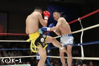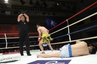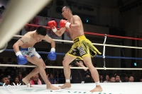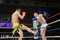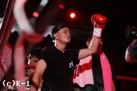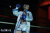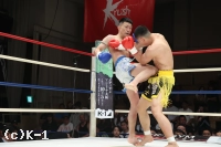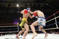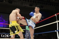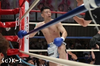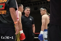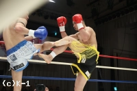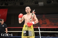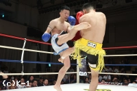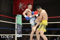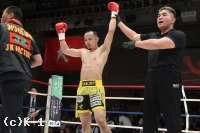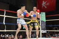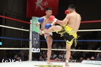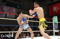 2R、変わらず前に出る新美。竹内は後退と同時に右ミドル。下がりながらのワンツーが新美のガードの合間をすり抜け顔面へ届く。被弾しながらも前に出るのを止めない新美は、下がる竹内へ左ローを三連打。さらに下がる竹内へ右ローを直撃させ、続く右ショートフックでダウンを奪う。さらに圧力を強める竹内へ、新美はパンチからローのコンビネーション。左インローを嫌がる竹内へ左ストレートを打ち下ろし、赤コーナーまで後退した竹内へ左ストレートを突き刺し2度目のダウンを奪う。立ち上がった竹内へ襲いかかった新美は最後に左フックで3度目のダウンを奪い、実力者・竹内をマットに沈めた。