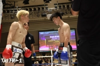 1R、原田が圧力をかけ前進。上田は下がりながらリーチの長い右ストレートを返す。原田はサウスポーにスイッチしながらワンツー、右ロー。入り際にカーフを合わせる上田に飛び込む原田が左フックを直撃させる。