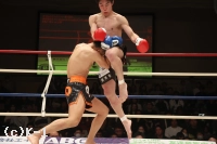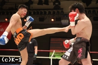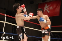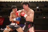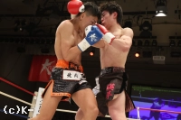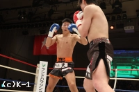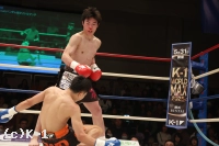 2R、プレッシャーをかける大夢だが、黒川も応戦。お互いのパンチが交錯し合う。大夢のプレッシャーに下がっている黒川だったが、右フックをヒットさせる。黒川はコーナーを背にしながらもパンチを打ちながら前に出る。大夢は左のカーフキック2連発。大夢は黒川をコーナーに追い込んでいくが、ここで黒川のカウンターの左フックが炸裂し、大夢がダウンする。黒川は立ち上がった大夢に右のフック。しかし、大夢も下がらず圧力をかけていく。そして右のカウンターのフックを放っていくが、ここでラウンド終了だ。