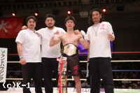 試合後、Krushバンタム級のベルトを巻き、トロフィーを受け取って記念撮影を行なった黒川。マイクを持ってファンに挨拶を行なった。