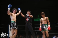 「名古屋の試合が1年ぶりで、去年の名古屋Krushからは名古屋で試合をしていなかったんですけど、ここで勝ててうれしいです。相手もすごく強くて、僕は打たれ弱いんですけど、めちゃくちゃパンチを打ってくれる選手だったんですけど、佐藤さんや石橋さんの引退セレモニーがあったんで、絶対に勝って2人に捧げたいと思いました。(延長戦で底力を出せた?)石橋さんにセコンドについてもらって『お前しかいないんだぞ。あとは勝つだけだ!』と言われて、そこで勇気と力をもらいました。(対戦相手については?)めちゃくちゃ強くて、今までで一番強いんじゃないかと思って、会見の時からめちゃくちゃ威圧感がありました。(今後は?)絶対にKrush-63kgのチャンピオンを目指して前進あるのみで、名古屋JKファクトリーの代表として会長にも恩返ししたいと思います」