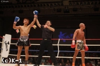 延長R、先に前に出たのは堀尾。右ロー・右ハイで匠を下がらせて、右フックを叩きつけて攻め込む。匠も右ストレートとボディへのヒザ蹴りを返して応戦。このラウンドも最後まで激しい打ち合いが続き、一進一退の攻防となったが、判定は2-1で堀尾の勝利。55kgのトップファイター対決を堀尾が制した。