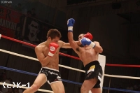 1R、中島がインローと奥足ロー。山崎も右ローと左ミドルで前に出る。中島はしっかりとガードを上げて奥足ロー、山崎はジャブを突き刺して右ローを蹴る。山崎が左ボディを狙うと、中島はヒザ蹴り。山崎がじりじりと前に出て右ボディ、右ミドル。中島もジャブを返して右ミドルを蹴り返す。山崎は中島にロープを背負わせて左ボディ。中島はガードを固めてローを蹴り返す。