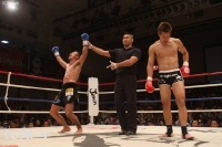 延長R、奥足ローとヒザ蹴りで攻める中島。これで一瞬、山崎の動きが止まる。しかし山崎も左右のボディブローで前に出る。中島とロー&ヒザ蹴り、山崎のパンチが激しく交錯する展開が続き、お互いに譲らない。残り30秒、山崎の右アッパーがヒットするが、中島も奥足ローとヒザ蹴りを返す。延長ラウンドも一進一退の攻防が続いたが、前に出続けた山崎が判定2-1で勝利。中島とのタフな接戦を制した。