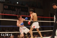 延長R、宮元の蹴りに戸邊が右フック、左フックとヒザ蹴りで前に出る。宮元も距離を取って左ミドルを蹴るが、戸邊は下がらない。そして宮元をロープに詰めた戸邊がヒザ蹴りから右ストレートから左フックと連打をまとめ、これで宮元からダウンを奪う。再開後、頭を詰めて打ち合う両者。戸邊は左右のボディ打ち、右から連打をまとめる。