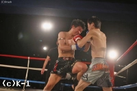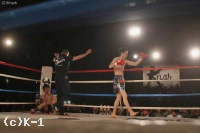 2R、左フックからパンチで飛び込む明戸。レオナはそこにミドルとヒザ蹴りを合わせ、明戸がバランスを崩したところでレフェリーがダウンを宣告する。レオナは立ち上がった明戸をコーナーにつめると右ストレートから左ボディ。そのまま一気に連打を打ち込み、明戸をマットに沈めた