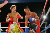 2R、パンチで前に出る結城に対して、武尊はインローとボディへのヒザ蹴り。これで結城を下がらせて、前蹴りと左ミドルで結城のボディをえぐる。結城は圧力をかけて武尊をコーナーまで下がらせて左右の連打。武尊も結城とパンチで打ち合い、左ボディを叩き込んで右ストレートを連打する。