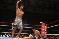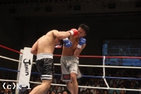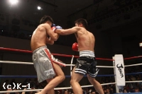 2R、長いリーチを活かし打ち合いを優位に進めた木村だが、ここで杉本が下からかち上げるように右ハイを放って当て、これで木村の長身を倒してダウンさせる。立ち上がる木村だが効いている。杉本は容易に距離を詰めると、左右のフックを振るう。木村はクリンチからヒザを放つももレフェリーからホールディングの注意を受ける。杉本はさらに右ハイ、木村に組まれても左右のボディパンチを連打する。木村はホールディングで再度の注意を受け、レフェリーから警告を発せられる。パンチの打ち合いでは回転のきく杉本が上回り、木村は懐に入られると思わず杉本を掴んでしまう。杉本はパンチだけにならず、右ローを浴びせながら木村に迫る。