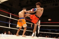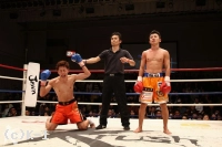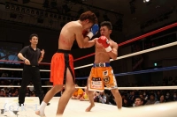 1R、サウスポーの両者。亀本が前蹴りと左ストレート、瀧谷もグルグルとリングを周って左ハイを蹴る。ジャブ・前蹴りで距離を取る亀本。これでしっかり距離をキープし、左ストレートを当てる。瀧谷も亀本のヒザ蹴りをブロックして左フック、ステップを使って飛び込むチャンスをうかがう。