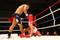 2R、上背で勝る藤橋はジリジリと前に出て大岩をロープに詰める。しかし大岩はここからプッシングで藤橋を押して出て、自慢の強打を右ストレート、右フックと当て、さらに放った右ストレートでダウンを奪う。立ち上がった藤橋だがダメージがうかがえ、フットワークで回ってなんとかこのラウンドをしのぐ。