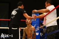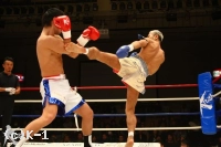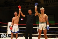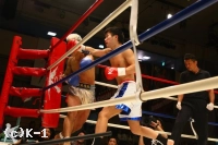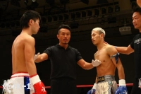 3Rも前に出ていく石川と、これを下がり・回りながら応戦する将という展開になる。将は左右ボディフックを放ち始めるが、石川は圧力を落とさない。だが、このボディブローは効いたかか、石川はややガードが落ち、表情も幾分苦しそうになる。さらに手数も落ち、ラウンド後半は右ジャブ、左ストレート、ボディへのヒザと将の攻撃が目立つ。