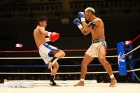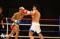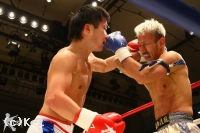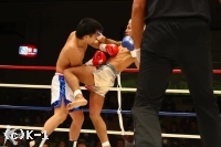 2R、石川はこのラウンドも圧力を発して将をロープに追い込み、左右のフックで襲う。将は鋭い左ミドル、ボディへのヒザを見舞うが、石川はタフさを見せ下がらない。将はラウンド後半には石川の圧力を持て余してきて、左右フックを被弾する場面が目立つ。