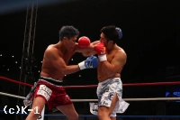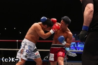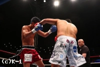 2R、初回で消耗があったかK-Jeeはややスピードが落ちる。これに対しKOICHIは歩むように前へ出て着実にローを蹴りためていく。跳びヒザを放つなどしKOICHIを下がらせたいK-Jeeだが、KOICHIは下がらずボディフック&ロー。10㎏の体重差が効いてきたかのK-Jee。左右フックからボディへのヒザを交え、KOICHIはローで追い足を効かせていく。