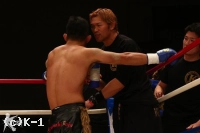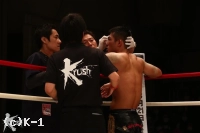 3R、KENJIは前進を強め、距離を潰して牧平の蹴りを封じに行く。牧平は左ローの連打から左ハイを顔に送り、これでKENJIは右こめかみ周辺をカットし出血する。傷は深く、ドクターがチェックを行うも続行不可能と判断しストップ。牧平が連敗脱出の勝利となった。