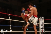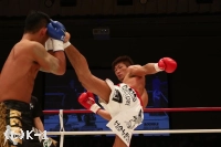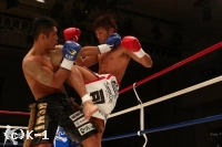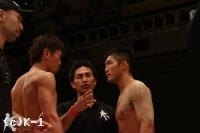 1R、オーソドックスのKENJIは右ミドルで先制するが、牧平は動じることなく得意とする左の蹴りをロー・ミドルと蹴り分けて返す。牧平はロープ際でバランスを崩して転倒したKENJIに倒れた後も攻撃を見舞ってしまい、これにKENJIは抗議する。KENJIはしかし逆にこれで火がついて前に出て、右ストレートで牧平をフラつかせる。しかし牧平も蹴り技に激しさを増し、ミドル・ヒザと見舞い、ハイキックをKENJIの側頭部に打ち込む。