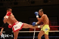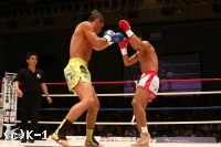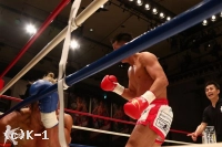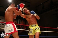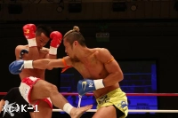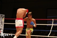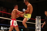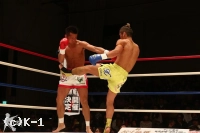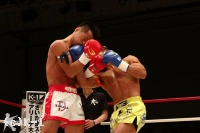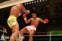 2R、闘士はストレートで打って出るが郷州はガードを破らせず、ヒザと前蹴りでのボディ攻めを続行。そして闘士がワンツーで打ち合いを仕掛けると郷州はこれを受けて立ち、右ストレートを打ち下ろしてダウンを奪う。立ち上がった闘士は左回りして冷静さを失っていないが、郷州はボディへの前蹴りと左右ストレートで追い詰めていく。ラウンド最後の打ち合いでも郷州の左フックが闘士をかすめて優勢。