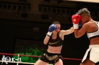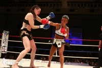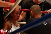1R、身長で上回るグレイスにKANAは出入りのステップを使い、接近すると左右のフックをボディに連打してこれでグレイスを嫌がらせる。距離を取ってグレイスがストレートを伸ばしてきても、KANAはよく見えている印象で頭を振ってかわす。そして踏み込んでの左ボディフックをグレイスに突き刺し、そこから右ローに繋げる。足も嫌がり始めるグレイス。KANAはグレイスのジャブに右ストレート、左フックとパンチを合わせ始める。