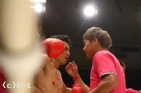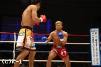2R、距離を詰めんとする大岩に対し、友尊は左右のローを放ってけん制。友尊は踏み込んで左ストレート、右フックを放っていくが、大岩はよく見えており当てさせない。友尊のバックブローの直後に大岩は右ロングフックを放って出るが、友尊はこれをグローブで弾く。両者は攻防に充実感があるか、笑顔でグローブタッチを交わす。