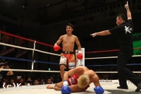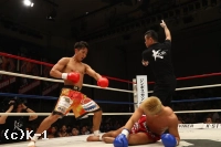 3R、大岩のハイキックの後に友尊は左フック、右フックを振るって前進。大岩をロープ際まで下がらせる。さらに友尊は跳びヒザを見舞うが、攻撃の切れ間を見逃さず大岩は右フックを強打。これで友尊を打ち抜いて倒し、KO勝利を上げた。